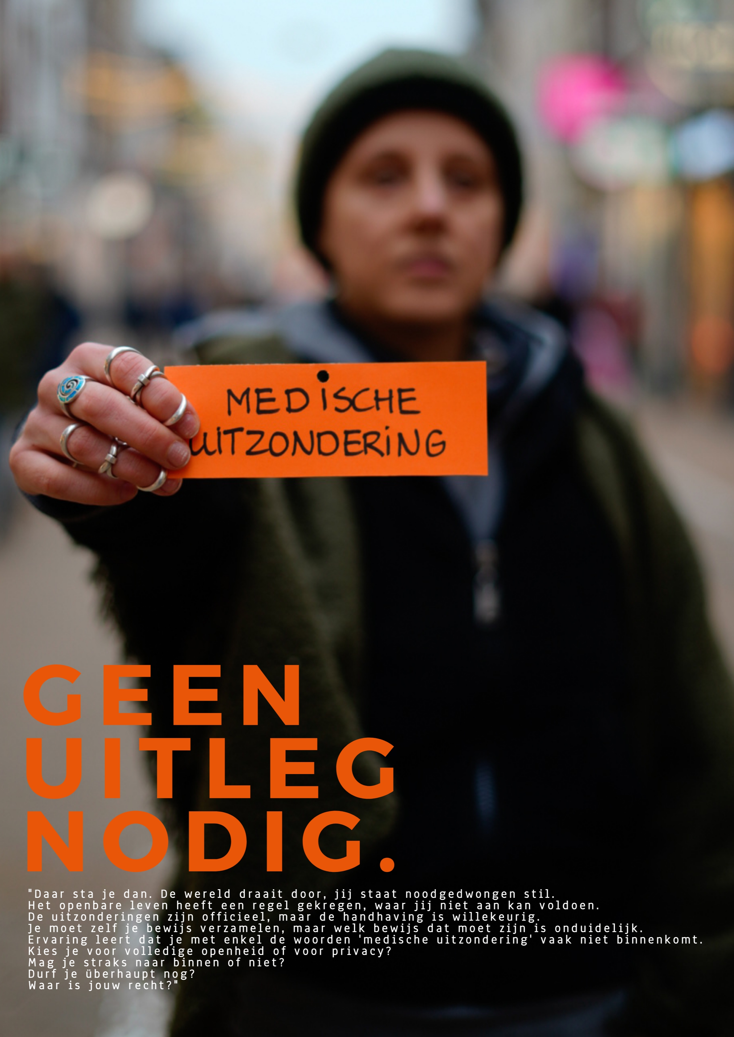 "Daar sta je dan. De wereld draait door, jij staat noodgedwongen stil. Het openbare leven heeft een regel gekregen, waar jij niet aan kan voldoen. De uitzonderingen zijn officieel, maar de handhaving is willekeurig. Je moet zelf je bewijs verzamelen, maar welk bewijs dat moet zijn is onduidelijk.